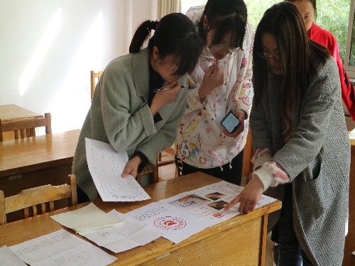 下午三点整,113教室的桌子上摆满每位参赛选手的作品,独特的思维配合着精湛的画工,每个印章的设计活灵活现。活动中,李美玲担任活动评选人,以认真的态度仔细评选每一份作品,秉承“公平公正公开”的理念打出分数。在评选过程中,参赛选手在现场与评委老师进行互动,详细讲解自己设计思路以及自己设计灵感。