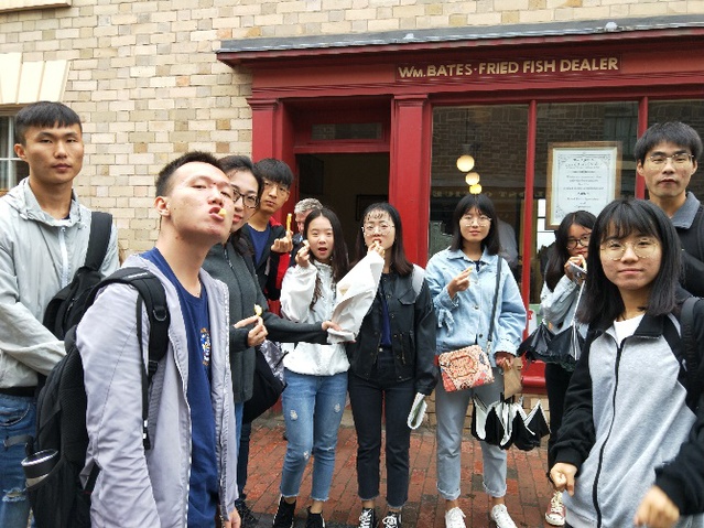 离开The Iron Bridge,访学团前往下一个地点Blists Hill Victorian Town,在路上大家讨论更多的是关于古老的Blists Hill Victorian Town的向往。进入 Blists Hill Victorian Town相当于回到了1900年的英国,可以在银行兑换古时候的硬币购买东西。小镇里的大部分东西都保持着古老英国的特点,有店铺,作坊,小工厂,学校,煤矿等,并且小镇里的居民都穿着1900年的衣服。Steve带领大家围绕小镇进行参观,在了解小镇文化的同时我们也品尝了英国的美食Fish&Chips。