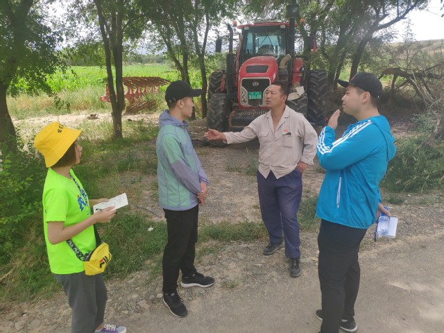 果树园子村,村庄暂留人口2084人,机械化普及程度达到80%,实践团队在队长盛祥振的带领下到达西吉尔镇政府与金书记就农业发展现状进行深入交流。耕种时节,每家每户使用家用小型农用机械,大部分农民会在当地的农业机械合作社租用大型农业机械进行统一耕种。由于外出工作与上学原因,村庄留有青年人数较少,主要依靠农业的机械化完成所有耕种。对于农田灌溉,当地使用地下管道滴灌和天山水渠引流浇灌的方式,其中滴灌占80%,避免地上安全隐患。了解大致情况,金书记驾车带领实践团队浏览当地农作物种植情况。