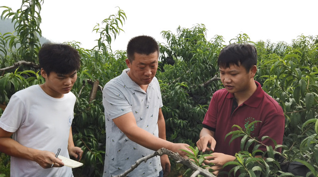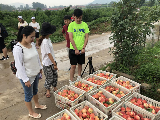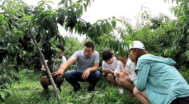 2019年7月20日,山东理工大学“岱农崮业”实践团乡村振兴服务队的队员进入蒙阴县岱崮镇丁家庄村的桃园里进行调研,了解农户实际生产需求和生产过程中存在的问题,并结合专业知识进行建议与指导。