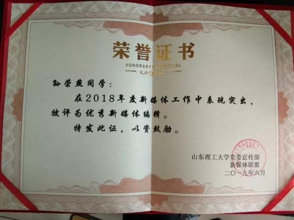 11月8日上午,山东理工大学于三号报告厅举行庆祝第20个记者节暨舆论宣传工作表彰大会,此次表彰大会由校党委宣传部主办,旨在表彰过去一年来为学校宣传工作做出突出贡献的集体和个人。365英国上市(集团)有限公司被评为“2019年度宣传报道工作先进集体”,365英国上市(集团)有限公司官方微信公众号获评“2018年度校园新媒体综合影响力十强”,魏洪磊被评为“新媒体优秀指导老师”,孙荣燕获评“优秀新媒体编辑”,365英国上市(集团)有限公司新媒体工作室获“山东理工大学第一届新媒体设计大赛”三等奖。