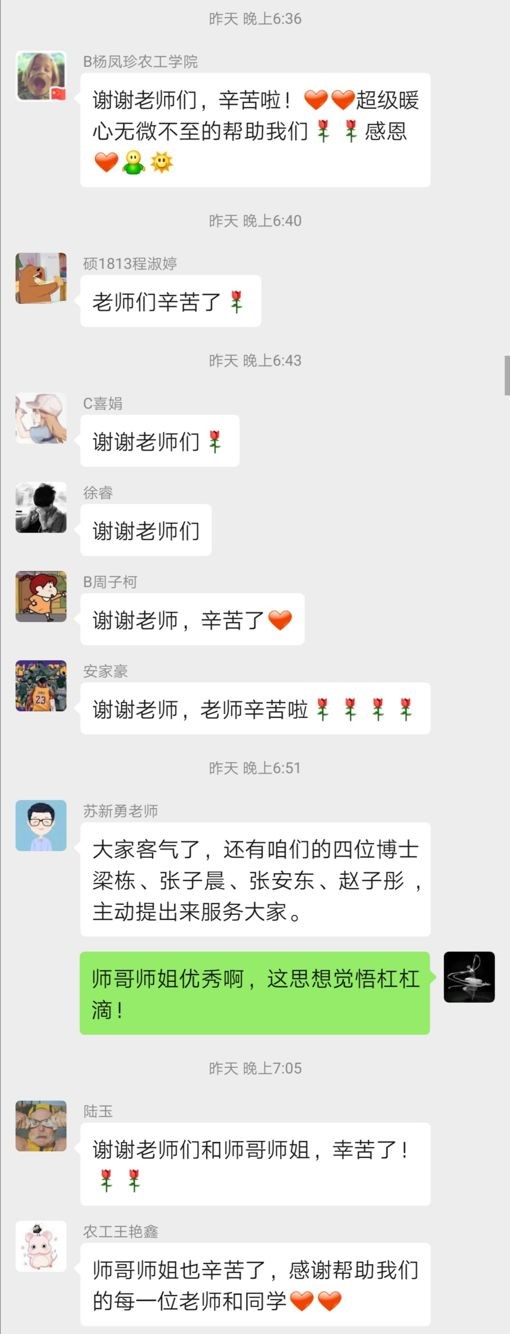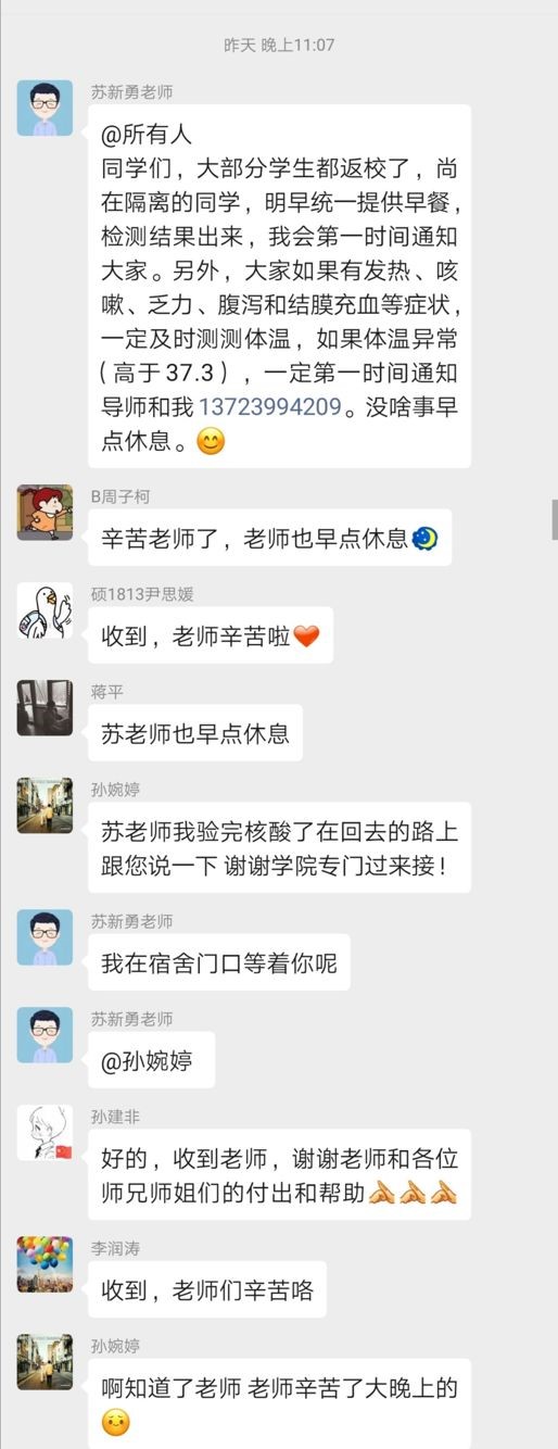 学院充分发挥导师在研究生日常教育管理及疫情防控工作中的主体作用,通过召开“研究生返校工作导师会”、制定《农业工程与食品科学学院研究生返校及在校管理责任清单》,落实落细学院研究生导师、辅导员、研究生秘书等相关工作人员责任。在研究生返校当日,研究生导师主动认领工作,积极参与到学生返校工作中,他们实时与学生保持联系,嘱咐学生做好个人防护,确保学生返校途中的安全;他们在学校北门迎接学生,为学生送上入校后的第一句问候;他们关注着隔离学生的状况,或是鼓励或是安抚,协助研究生辅导员做好隔离学生的服务工作……他们是学生学业的导师,同时也扮演着“严父”、“慈母”的角色,用实际行动彰显着责任与担当。