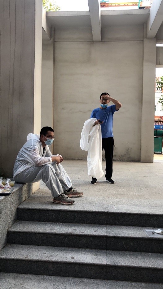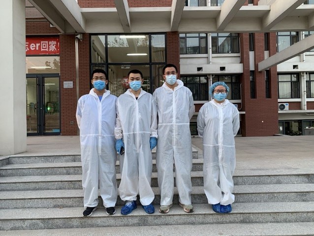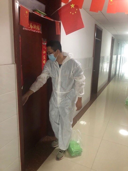 在首批返校的服务工作中,有四个身影,他们奔波于研究生公寓的56个隔离宿舍,为师弟师妹们提供贴心的服务,他们是学院的博士志愿者赵子彤、张子晨、梁栋、张安东,其中3人是中共党员。在学生返校前期,四位博士就找到研究生辅导员苏新勇,主动要求在研究生返校期间从事志愿服务工作。他们帮助老师做好返校学生的登记工作,为返校学生提行李,为尚在隔离期的学生送餐、送水、送被子……三十多度的高温,隔离服里的衣服早已湿透,但红通通的脸上却一直保持着微笑,服务的热情没有丝毫的减退。他们的付出让老师、学生为之动容,他们用行动传递着青年人的正能量!