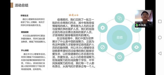 此次班级心理活动设计比赛的顺利开展,有效的帮助同学们以特殊时期的身心感悟解读生活的价值,重新诠释生活的意义,让同学们用最积极的心态面对生活,在大学生活中健康快乐成长。