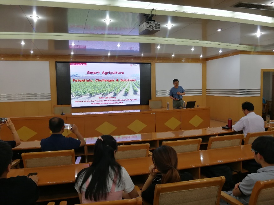 下午,张勤教授在鸿远楼报告厅开展了一场智慧农业的讲座,张教授详细介绍了美国农业机械的发展进程与先进的前沿技术,结合美国的发展道路,在科研成果产业化方面发表了自己独到的见解,他认为,科学技术在解决社会问题的同时,要充分考虑社会化效益,否则农机产品在推广过程中会遇到很多阻碍。张教授展示了他在美国农机研究方面的科研成果,重点分享了竹笋收获机械在实际作业时遇到的行间距以及生长状态不一致方面的研发解决经验。在对智慧农场的理解方面,他认为,智慧农场应以解放人力为主,采用科技的手段获得较高的经济效益,维持生态的可持续发展。他相信,将来可以实现对无人机械的远程指令与在线机械作业信息的回传。