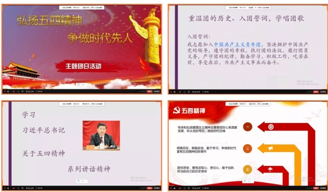 同学们学习了习近平总书记在纪念五四运动100周年大会上的重要讲话。打开麦克风,一同重温宣誓誓词。参加了人民网新媒体平台的“我们都是收信人”活动。支部成员自行录制了团歌,完成了一次“云”合唱;支部成员自行选择观看《建党大业》、《建国大业》等具有历史意义、积极向上的影片,并以宿舍为团小组自行选取片段,再深入理解的基础上进行配音。青年团员自主运用历史的长镜头、广角镜深入学习五四运动精神内涵和历史意义。