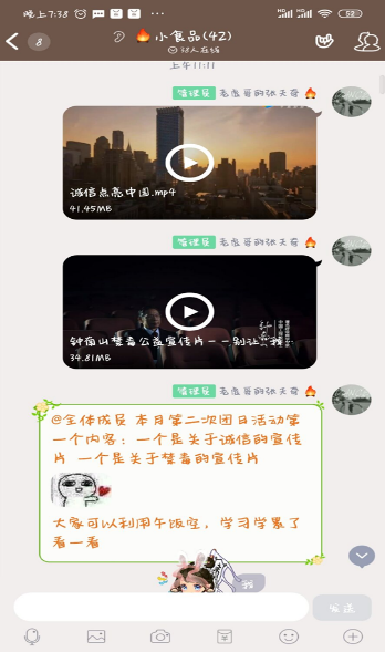 2020年6月26日上午,食品1901班在班级QQ群内开展“用实力验证自我,以诚信构筑人生”主题团日活动。团支书在班群内上传挑选出的诚信考试宣传片、禁毒公益宣传片,由同学们在线观看学习。经过学习委员动员,班级同学积极投入到复习状态,在期末复习期间将学习小组作用最大化,线上学习为更加便捷的讨论带来更大的可能性。在团日活动过程中,各小组对于复习中的疑难进行分别讨论,每小组讨论推送出重点、好题在班群内分享。除此之外,同学们在班群上传学习笔记,以此督促自己的复习进程。