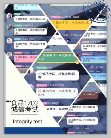随着时间的流逝,期末考试也渐渐接近尾声。食品1702班团支部为使“诚信考试”意识贯穿考试始终,于6月29日以团小组为主,组织同学们继续深入了解考试要求,团支部全体成员在班级群接龙表明态度,表示诚信考试将从自身做起。