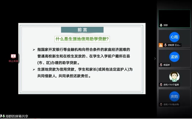 会议伊始,郑群向同学们重点讲述了助学贷款申请、受理、发放、毕业确认、还款等内容,并开展诚信教育及金融借贷知识宣讲,引导学生主动、按时、履约还款。