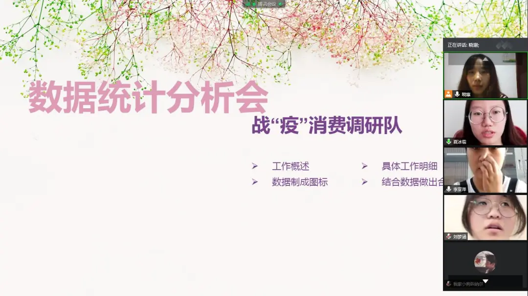 7月25日早上在腾讯会议开了线上社会实践动员大会,会上队长于晓薇同学在会中讲述了团队成员在接下来的几天中需要做什么。之后,实践团所有成员在各自的QQ空间里发布了介绍团队的说说。为了能够充分认识到疫情带给我们经济影响,深知人们对疫情过后消费情况的变化,通过对其中变化的分析了解到疫情形势的严峻,同时对疫情过后的经济发展于恢复提供可靠的数据支撑,为战胜疫情贡献我们的一份力量。