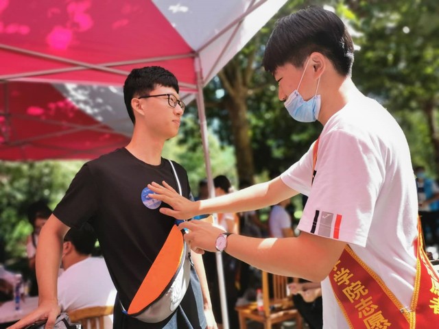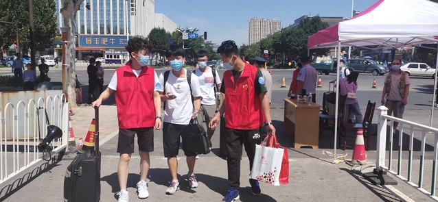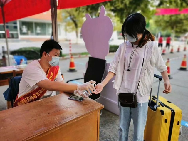 令人感动的是,在返校现场的志愿者是一道亮丽的风景线,甚至很多志愿者都是刚刚返校的学生,放下行李立即加入到志愿者的行列中。他们身披红色绶带,在校门帮助返校生运输行李,介绍如何出示身份与健康证明,来回奔波于楼层宿舍之间,微笑伫立于骄阳之下。