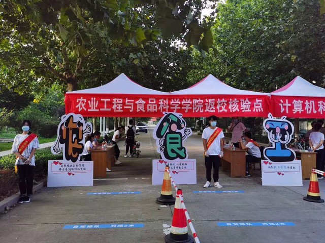 学院辅导员和志愿者提前抵达报到现场,精心准备“农”“食”“工”表情包迎接返校同学,返校学生纷纷和本专业表情包合影留念。