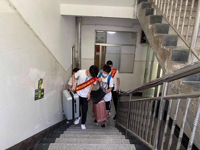 令人感动的是,在返校现场的志愿者是一道亮丽的风景线,甚至很多志愿者都是刚刚返校的学生,放下行李立即加入到志愿者的行列中。他们身披红色绶带,在校门帮助返校生运输行李,介绍如何出示身份与健康证明,来回奔波于楼层宿舍之间,微笑伫立于骄阳之下。