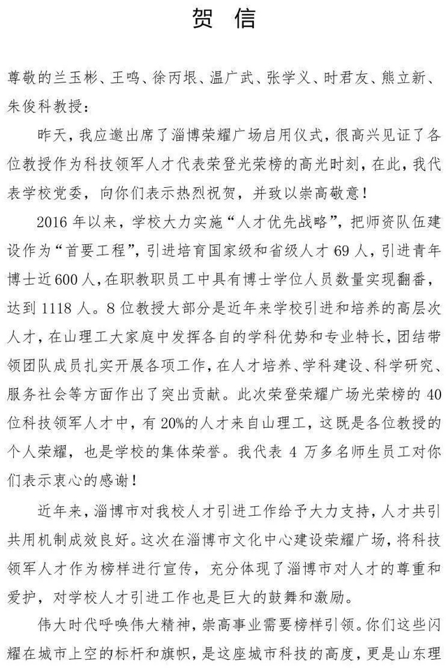 校党委书记吕传毅应邀出席淄博荣耀广场启动仪式,见证了8位教授作为领军人才代表荣登光荣榜的高光时刻,并专门给教授们写了贺信,代表学校党委,向他们表示热烈祝贺,并致以崇高敬意。