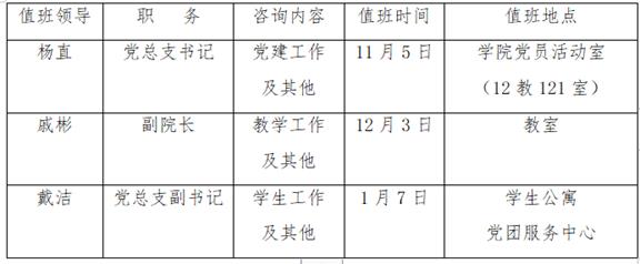教学周每周一至周五,辅导员进入学生公寓党团服务中心值班(15号公寓308室),现场办公受理学生业务,走访宿舍了解学生情况。