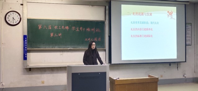 培训前,戴书记从同学们实际生活出发,以共享单车乱停乱放以及个别高年级学生宿舍脏乱差现象引出校园文明礼仪问题,引发普遍共鸣。随后,戴书记从礼仪概说、仪态仪表、大学生礼仪和学生干部应掌握的社交礼仪四个部分讲授,先后向同学们详细讲解了站姿、坐姿、仪容、穿着、握手礼、介绍礼以及在校大学生应遵守的校园礼仪等标准礼仪规范。讲解过程中,戴书记不时亲身示范,还热情邀请学生上台互动,进行现场指导,以增强学生体验感。戴书记强调文明礼仪是人与人之间交往的需要,适度恰当的礼仪可以拉近人与人之间的距离,表达尊重,增进情谊,礼仪存在于我们生活的每一个细节,体现在我们的言行举止,“细节决定成败”。戴书记期望大家作为“农工先锋”当能“知礼、懂礼、守礼、用礼”,做一名爱己爱人的现代大学生。
