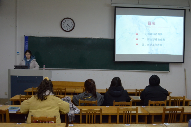 农机1804团支部代表张蔚然答辩时,她提到了团支部建设目标为建设学习型团支部,并介绍为实现此目标开展的英语单词打卡、周末集中学习等特色班级活动。