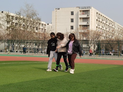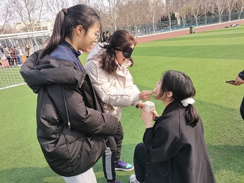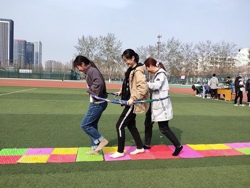 此次比赛主要考察各队队员之间的配合技巧与默契程度。活动之中,最受欢迎的项目当属三人四足,操场之上,可以看到一组组队员脚上绑着绳子,嘴上喊着响亮的口号,三个女生一组的队伍与两女一男的队伍不分伯仲。时不时,可以看见她们脸上洋溢着快乐的笑容,每一组都认真地练习着,争取最终取得满意的成绩。走向棉花糖大作战比赛场地,一人正镇定地指挥另一名戴眼罩的女生向目标点走去,“向左,向左,直走……”女生在队员的指挥下坚定不移地向前迈去,到达目标点,最后一名女生以迅雷不及掩耳之势吃完四块棉花糖,紧接着,三人一起携手跑向终点,胜利!她们欢呼着,对所获成绩甚是满意。