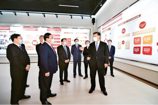 2020年11月12日,浦东开发开放30周年庆祝大会在上海市举行。中共中央总书记、国家主席、中央军委主席习近平在会上发表重要讲话。这是当天上午,习近平等参观“在国家战略的引领下——浦东开发开放30周年主题展”。 新华社记者 殷博古/摄