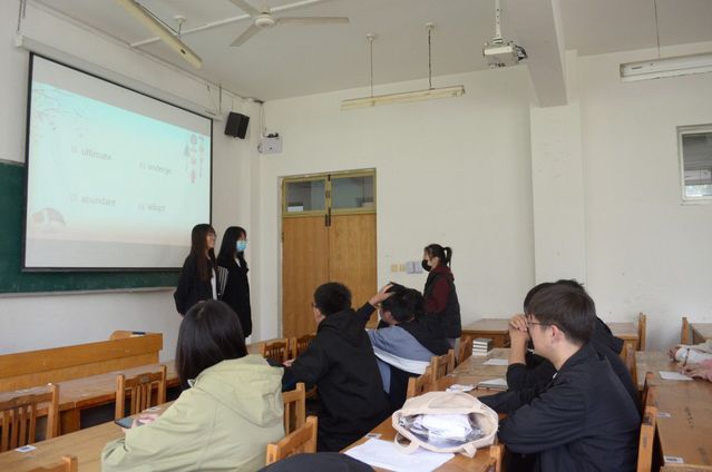 各小组同学提前分组,到达现场后争分夺秒再次熟悉英语单词,积极讨论如何形象描述英语单词,现场气氛热烈。第一组同学率先上场,背景屏幕随机出现英文单词,一名同学通过描述形容单词的汉语意思,台上另外两名同学反应迅速,拼写出对应单词,配合默契。所有参赛队员均完成挑战后大赛结束,比赛结果由学习部成员统计各组答对词汇数目后公布。