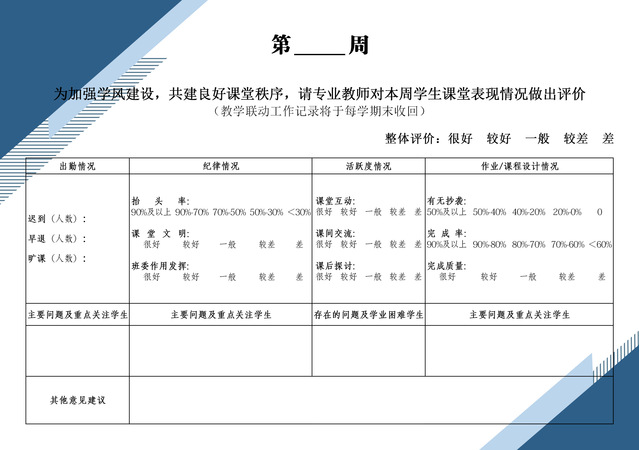 辅导员每月进入课堂与任课教师进行一次面对面交流,使任课教师了解学生学习状态,帮助教师掌握学生心理、思想等方面的情况。《教学联动工作记录》由任课教师每周对任课班级从出勤情况、纪律情况、活跃度情况、作业/课程设计情况进行评价,每月反馈给辅导员各班级学风整体情况、主要问题及重点关注学生等信息,《教学联动工作记录》于学期末收回,实现教学与管理双向联动。