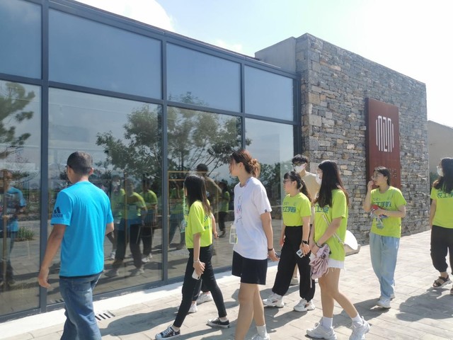 在接待员的带领下,团队领略到柿子红理想村里的“小确幸”。绿乐园开阔的视野和静谧的环境、山野风味、亲子旅游的娱乐项目都成为了宝妈宝爸们的亲子拓展乐园。绿乐园里融“绿色”、“共享”、“艺术”于一体,充分展现绿色美丽乡村的风貌,同时艺术设计等专业学生可以在这里进行研学考察。接待员提到这里的花海都会被充分利用,将花瓣进行敲染,可以将花海的印记长存,也符合绿色可持续发展的理念。
