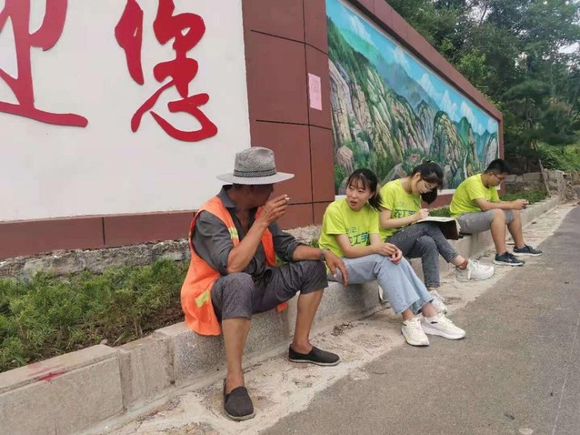 经研究,墙绘地址初步定为西北域村入口处,墙绘组成员将乡村振兴与西北域村当地特色产物相结合设计底稿。宣传视频的拍摄地分为村外、村中、后山。拍摄视频途中,实践队队长张雪洁就改革开放下百姓生活变化为主题同村民交谈。村民刘同喜说“改革开放前,村民紧衣缩食,每家每户都在为生活发愁,现在政策好了,就拿自己来说,有着稳定的工作收入,不愁吃穿,村里还建了老年公寓,留在村里的老人都有了着落。”
