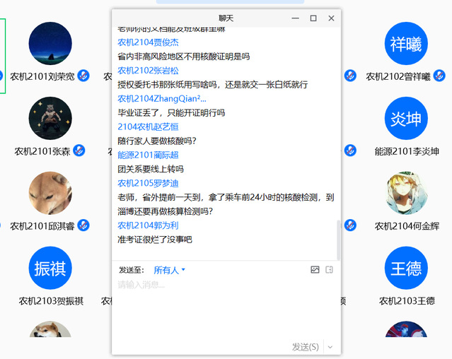 最后,辅导员与新生开展线上交流互动,同学们对学院和辅导员的温暖关怀表示感谢,同时表达了对大学生活的憧憬与向往。辅导员也就学生关心的饮食、住宿、学费缴纳、团组织关系转接等问题进行了详细解答。