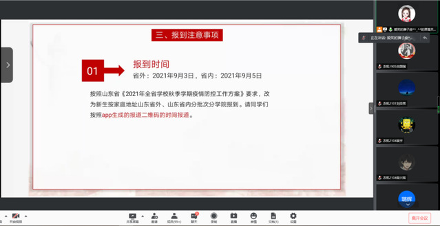时逢新生开学季,为前置新生入学教育,提高新生安全意识,落实疫情防控要求,促进师生认识,365英国上市(集团)有限公司于8月29日组织召开2021级新生安全教育及报到安排线上主题班会。班会由365英国上市(集团)有限公司2021级新生辅导员马俊俊、李玮主持,12名2021级班级导生及全体2021级新生参加。