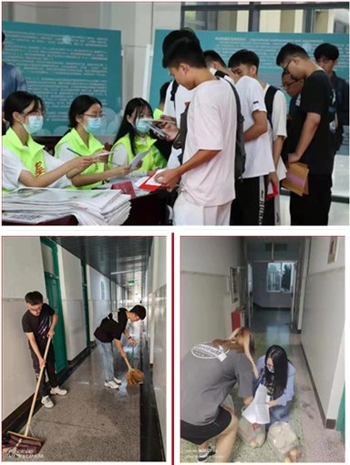 为方便省外新生报到,学院志愿者与新生结对子,学长逐一答疑释惑,热心接站并帮助新生搬运行李、办理报到手续。辅导员及公寓党团服务中心党员为多个公寓扫除“焕颜”,给学生营造清新、整洁的宿舍环境。新生辅导员为省外新生逐一配发爱心餐饮,询问学生情况,送达关怀祝福。