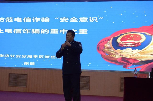 张店分局学区派出所副所长张健通过PPT、案例相结合的方式详细讲解了刷单返利诈骗、冒充客服退款诈骗、“杀猪盘”诈骗、冒充熟人诈骗等多种高发电信诈骗案件套路手法,张健所长结合山东理工大学案例面对面与学生交流,用发生在学生身边的故事引导学生提高反电诈意识。