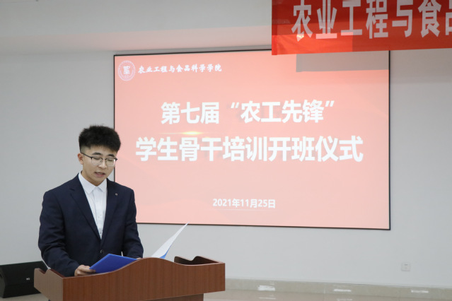 仪式开始,全体起立奏唱国歌。随后,郑群宣读《农业工程与食品科学学院第七届“农工先锋”学生骨干培训方案》,就培训课程、培训安排、培训考核及培训纪律进行了介绍。