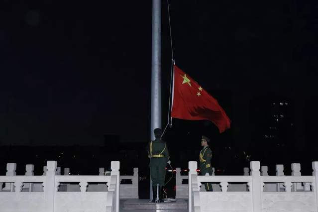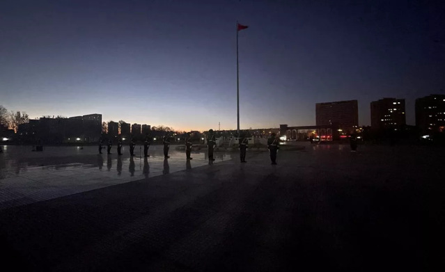 升旗仪式正式开始,我校国旗护卫队迈着整齐的步伐,昂首挺胸、目光坚定、步履铿锵地走来。国歌缓缓奏起,虽冬日寒风凛冽,但全体师生注视着冉冉升起的国旗,心中倍感汹涌炽热,鲜艳的五星红旗随风飘扬在空中。