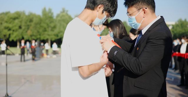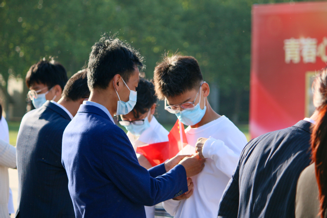 团干部为新发展的团员代表佩戴团徽。2021年度优秀团员标兵、农工学院学生张晓航领誓,团员青年代表举起右拳,面向团旗,重温入团誓词。全体师生齐声合唱《光荣啊,中国共青团》。