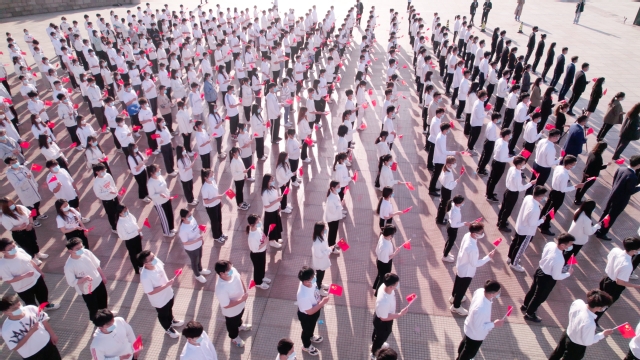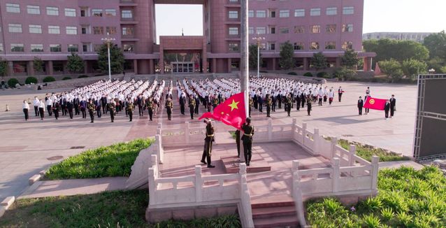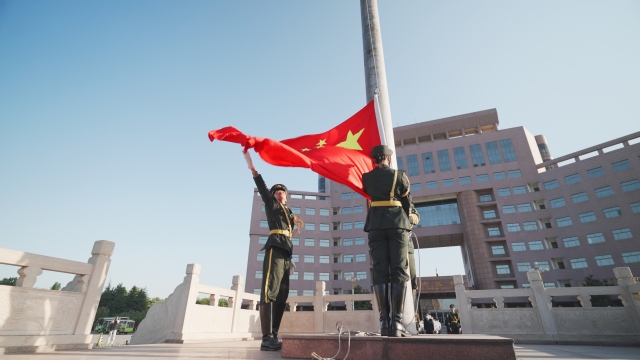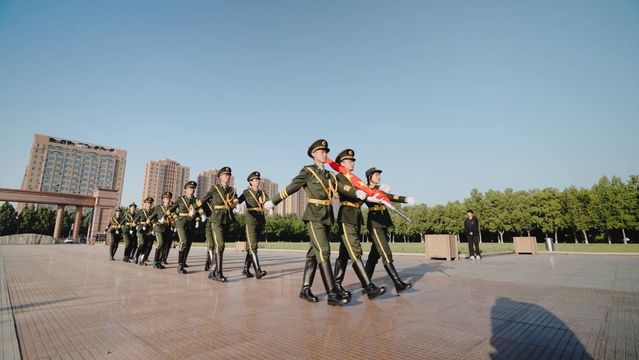6时40分,升国旗仪式开始。在国旗护卫队的护送下,升旗手步入升旗台,伴随着激昂雄壮的义勇军进行曲,鲜艳的五星红旗徐徐升起。全体人员向国旗行注目礼、高唱国歌。