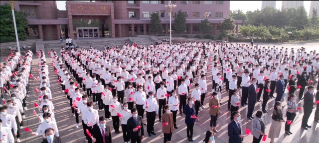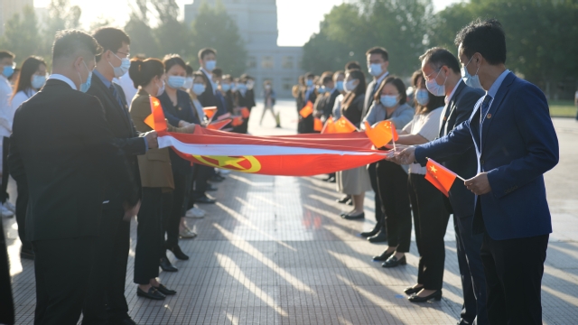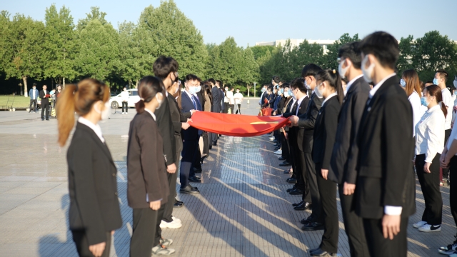 升旗仪式开始前,举行传递团旗仪式。团旗依次从团干部传递给博士生、硕士生、大四至大一团员青年及新发展团员代表的手中,团旗的手手相传,承载了荣光与责任,激励着广大团员青年拿稳接力棒,不忘“来时路”,走好“脚下路”,坚定“未来路”。