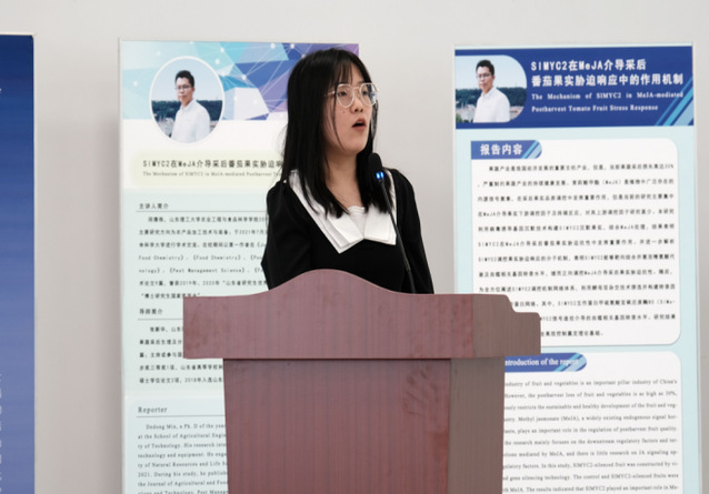 闵德栋汇报的题目是“SlMYC2在MeJA介导采后番茄果实胁迫响应中的作用机制”,本研究解析SlMYC2在MeJA介导采后番茄果实病害胁迫响应中的作用并解析其分子机制。研究内容主要分为三个方面:一是解析MeJA对采后果实自噬活性的诱导效应,及自噬在MeJA介导采后果实品质劣变调控中的作用;二是揭示SlMYC2通过靶向结合并激活自噬相关基因的转录水平,参与MeJA介导果实抗病性;三是SlMsrB5参与MeJA-SlMYC2信号途径介导采后果实代谢调控。本研究为实现采后果蔬品质的安全高效控制奠定理论基础。