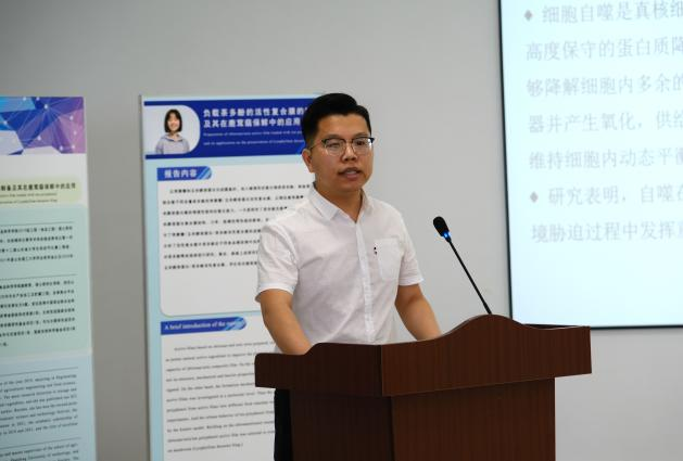 宋元达教授依次向与会人员介绍了本场报告会的主讲人及其汇报内容,博士研究生闵德栋,硕士研究生王晓敏、黄靖程、周肖楠分别作了题为“SlMYC2在MeJA介导采后番茄果实胁迫响应中的作用机制”、“负载茶多酚的活性复合膜的制备及其在鹿茸菇保鲜中的应用”、“双金属纳米材料生物传感器的构建及其在蔬菜中农药多残留检测的应用”、“白菜废弃物混菌厌氧发酵产己酸研究”的学术报告。