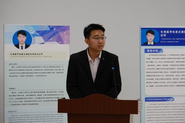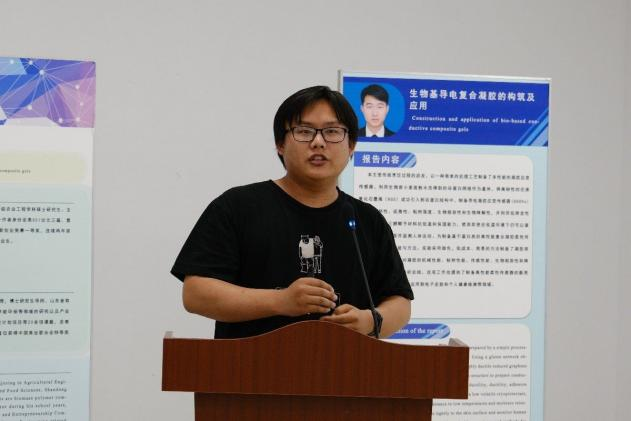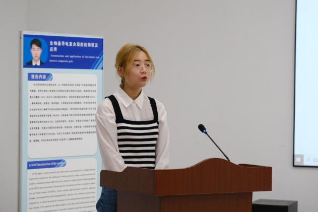 徐航汇报的题目是“生物基导电复合凝胶的构筑及应用”,研究内容为还原氧化石墨烯含量对材料力学性能的影响。针对不同含量的石墨烯,不同基质,不同含水量等因素对材料粘附性能的影响,通过实验进行表征,并对机理进行解释;丙三醇有机溶剂对材料低温耐受性和保湿性能的影响;材料不同温度下的传感性能。