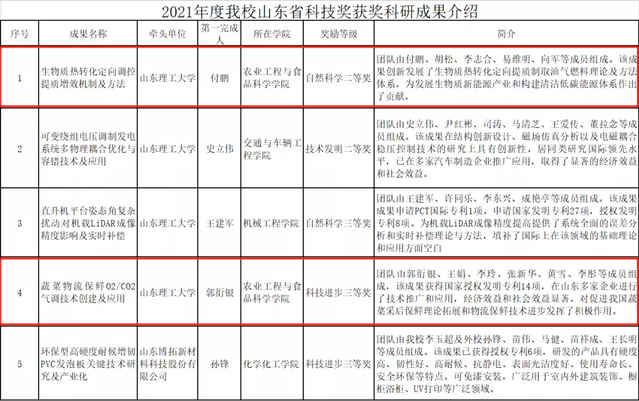 其中,付鹏教授等申报的“生物质热转化定向调控提质增效机制及方法”荣获山东省自然科学奖二等奖,郭衍银教授等申报的“蔬菜物流保鲜O2/CO2气调技术创建及应用” 荣获山东省科技进步奖三等奖;均为第一完成单位完成。
