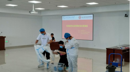 活动开始,农工学院李发兰、王阵贺老师带领黄靖程等几位研究生对实验室危险化学品废弃物泄漏场景进行模拟演练,演示了一名学生在实验过程中,氯仿废液发生倾倒泄露的事故。当事学生随即向实验室负责人报告,实验室负责人立即组织实验人员有序撤离,进行现场封锁。实验室负责人进行事故危害评估,并向学校应急小组报告。应急小组接到报告后迅速启动应急响应,指挥应急管理人员前往现场处置。应急管理人员准备好应急物资快速抵达现场,在了解相关情况后,应急管理人员穿戴好安全防护装备,携带危化品处理装备进入实验室,清除泄露源,清理污染区域。任务完成后,应急管理人员撤出实验室,进行洗消,事故处置工作完毕。通过现场演练,与会师生对化学品泄漏事故的应对流程和处置方法有了直观的认识。