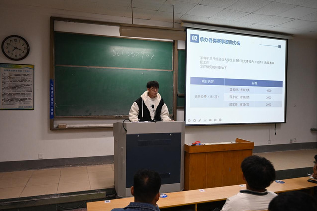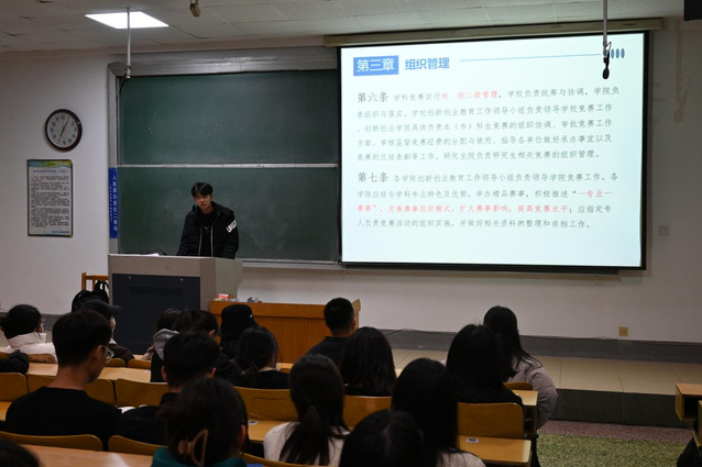 竞赛部负责人介绍了《山东理工大学学生创新创业竞赛管理办法(试行)》和《农业工程与食品科学学院大学生创新创业资助管理办法(试行)》,详细解读了学院对科创竞赛的支持与奖励,并就竞赛的类别、重点赛事的参赛情况和举办周期、支持保障及其成果使用进行了重点讲述,让同学们更好、更快地了解学校及学院创新创业工作情况。