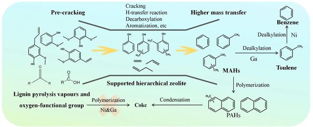 木质纤维素生物炼制的快速发展实现了绿色燃料、化学品的高效制取,然而生物炼制产生的大量富含木质素的废渣尚未得到合理的利用。以纸浆工程为例,每年可产生高达5000万吨的木质素废渣,主要作为低品位燃料进行燃烧处理,导致了严重的环境污染,限制了生物炼制企业的绿色循环发展。木质素具有独特的芳香结构,是自然界中最丰富的可再生芳香聚合物,是制取高值芳香族化合物的优质原料。芳烃化合物,特别是单环芳烃,是有机化工重要的基础原料,其与汽油分子量区间相近,可作为添加剂来提升汽油辛烷值,目前主要来自于传统的石油炼制,对可再生来源单环芳烃的生产工艺研究迫在眉睫。因此,开发木质素向芳烃的定向转化策略对于实现木质纤维素生物质全组分利用以及生物炼制产业绿色循环发展意义重大。同时,木质素的高值转化有助于解决环境和能源问题,助力国家“双碳”目标的实现。