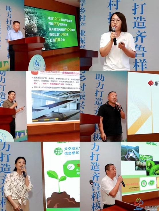 我校农业工程与食品科学学院教授付鹏、生态无人农场研究院教授张彦斐、博山区源泉镇党委书记李晓剑、人大副主席吕海峰、山东七河生物科技股份有限公司董事长苏耜同、淄博乐悠悠农业科技有限公司总经理张慧英、烘干大数据服务(山东)有限公司总经理刘振彬、山东思远农业开发有限公司总经理白京波分别作了主题分享报告。