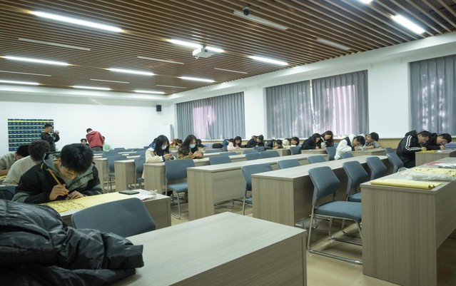 本次比赛形式分为硬笔字和软笔字,选手参加现场比赛书写作品。比赛中,来自12个学院的49名选手专注书写,全神贯注,一笔一划尽显自己的书法才能,感受书法带来的独特魅力。