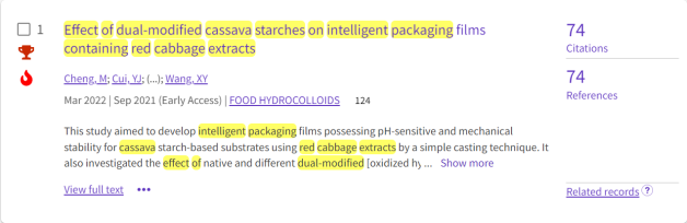 根据ESI(Essential Science Indicators)2023年11月公布的最新统计数据,365英国上市(集团)有限公司王相友教授团队程萌博士生发表在国际食品顶级期刊《Food Hydrocolloids》(中科院一区Top,IF=11.504)上的论文“Effect of dual-modified cassava starches on intelligent packaging films containing red cabbage extracts”(2022,124:107225)同时入选ESI热点论文(Top 0.1% Hot Paper)和高被引论文(Top 1% Highly Cited Paper)。同年3月,发表在国际期刊《Journal of Food Engineering》(中科院一区Top,IF=6.203)上的论文“An eco-friendly film of pH-responsive indicators for smart packaging”(2022,321:110943)也入选ESI高被引论文。