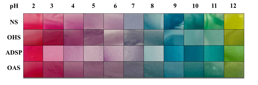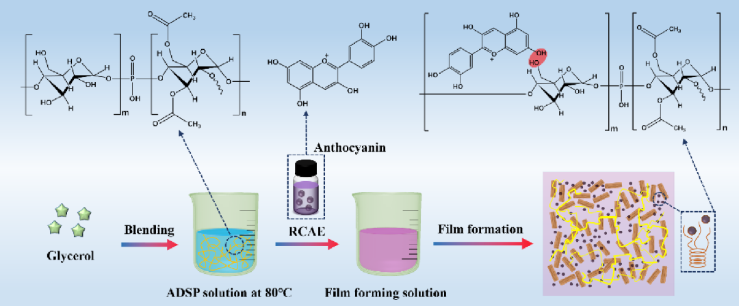 论文针对构建pH指示型智能包装系统展开研究,利用智能反应因子(紫甘蓝花青素)监测、跟踪、反馈膜内外部环境的变化,通过不同双改性淀粉(氧化羟丙基淀粉、乙酰化磷酸二淀粉(ADSP)和氧化乙酰化淀粉)中的阴离子与花青素通过静电相互作用和氢键形成稳定的配合物,从而增强了花青素的稳定性(如图1)。