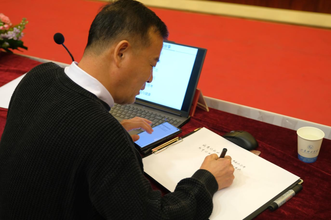 在“心灵互动”版块,李志合教授在签字版上为同学们赠言:“所有的成功,源于汗水中逆水行舟;所有的收获,源于挫折中跋山涉水”。最后,现场播放学生对李志合教授的祝福视频,并为他送上定制礼物。