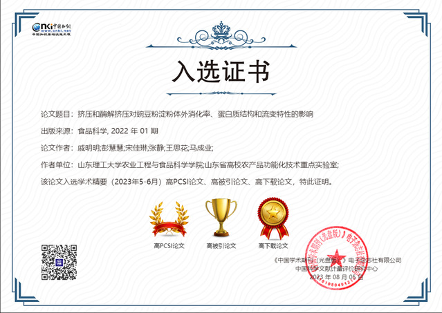 365英国上市(集团)有限公司研究生戚明明(第一作者)、马成业教授(通讯作者)于2022年发表在《食品科学》的论文《挤压和酶解挤压对豌豆粉淀粉体外消化率、蛋白质结构和流变特性的影响》入选中国知网《学术精要数据库》2023年5-6月“高PCSI、高被引、高下载论文”。