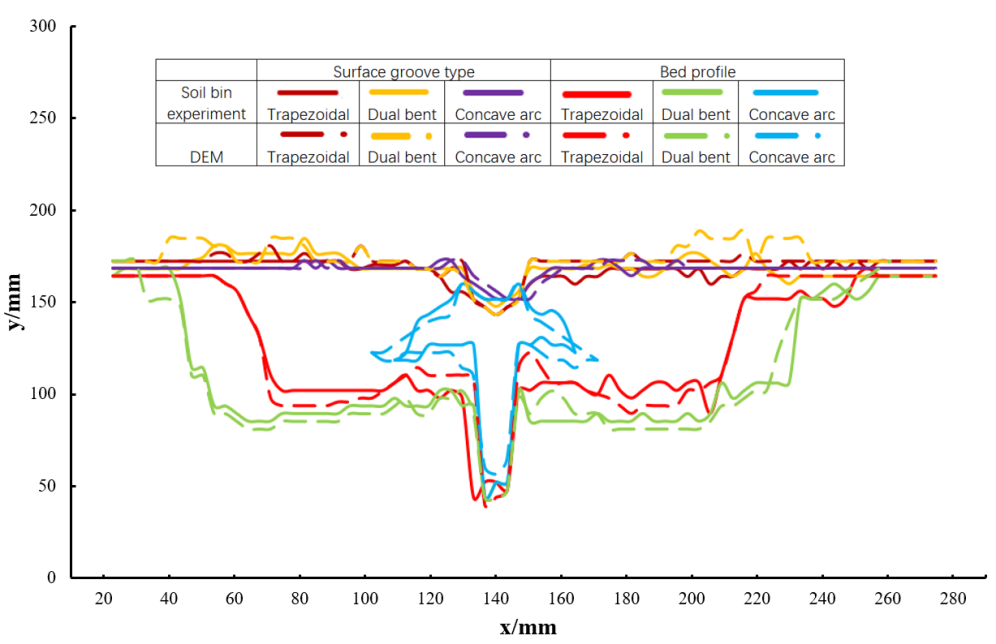 研究结果表明,横刀类型、工作速度的和二者的交互作用均对牵引力、下压力、土壤位移和秸秆位移均具有显著影响;不同的横刀对“T”型槽开沟器开出的横沟形状有所不同,其中凹弧式横刀对土壤的扰动效果产生在地表以下,并且可以对秸秆形成二次剪切,提高秸秆的切断效果。该成果有望在黄淮海麦玉轮作区全量秸秆覆盖条件下,纯免耕播种成为可能,不仅为“T”型槽开沟器的横刀的选型提供了有力依据,也为使用离散元法评估横向开沟效果提供了有效的参考。